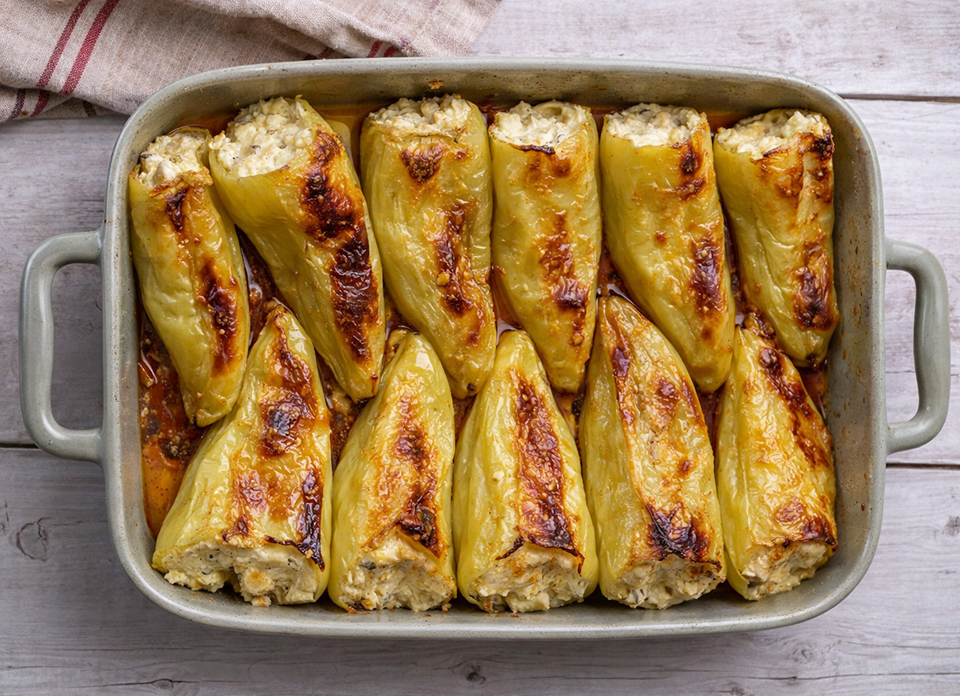 Spërkatini me pak vaj dhe futini në furrë të parangrohur në 180°C për 20 minuta, derisa specat të zbuten dhe të marrin ngjyrë të artë sipër.